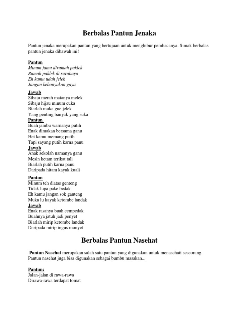Contoh Pantun Lucu Teka Teki Agama Nasehat Jenaka Cinta from pengajar.co.id Pantun nasehat untuk anak sd. Maybe you would like to learn more about one of these? We did not find results for: Check spelling or type a new query.